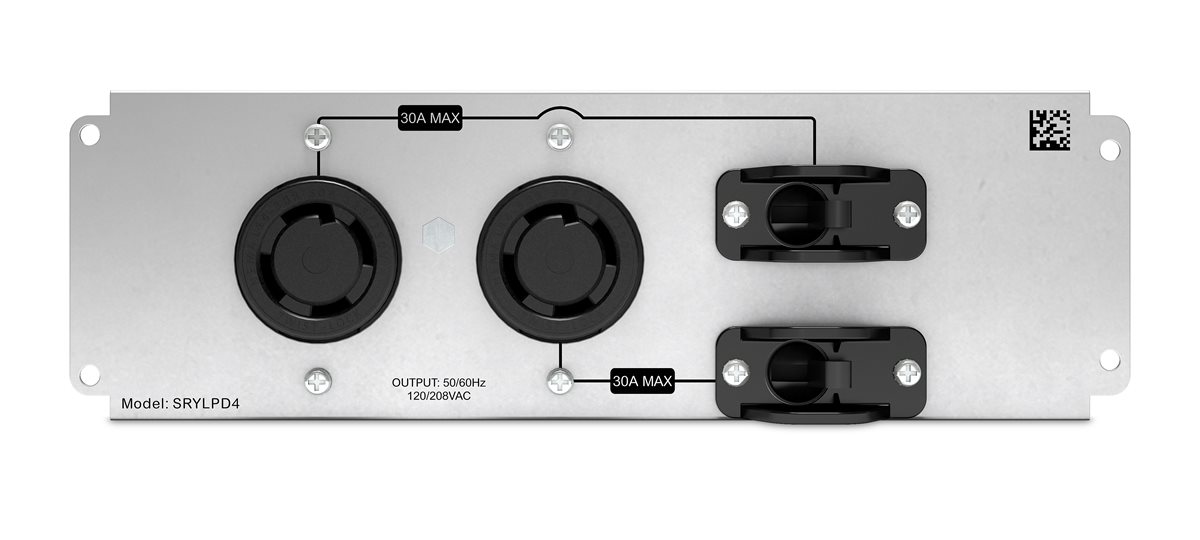 The APC Smart-UPS Modular Ultra has 3 blanking panels that can be replaced with user selectable PDU panels. The SRYLPD4 features 2x NEMA L14-30R 208V receptacles, each with breaker control.