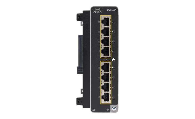 Cisco IEM-3400-8T An Industrial Ethernet Module (IEM) for IE3400 switches, adding 8 copper Gigabit Ethernet ports. UPC: 889728223386
